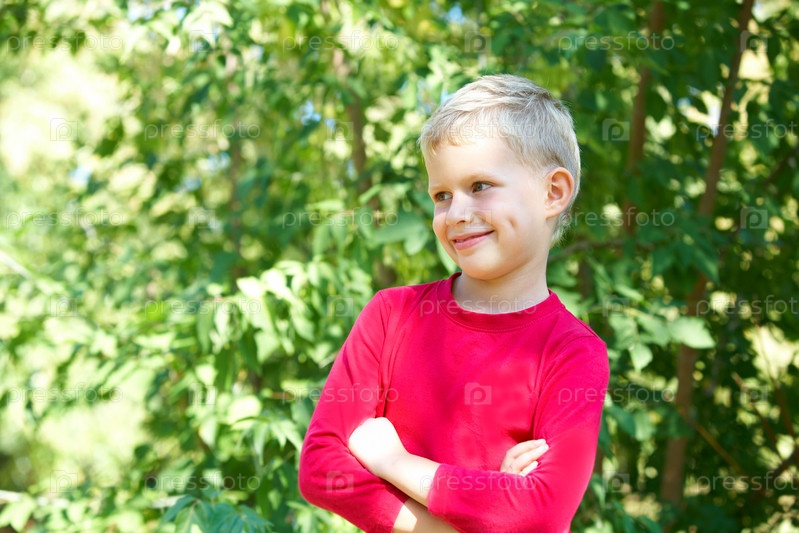 Улыбающийся мальчик в красной кофте на фоне листвы