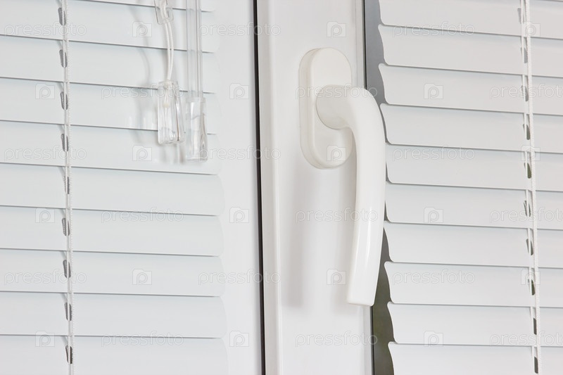 Ручка белого пластикового окна с жалюзями