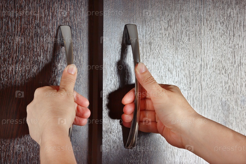 Женские руки открывают двери шкафа из темного дерева