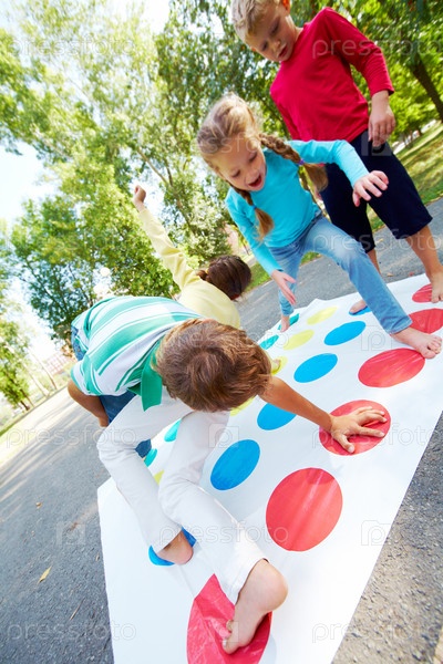Дети играют в твистер на свежем воздухе