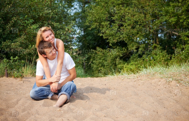 Счастливая молодая пара сидит на песке