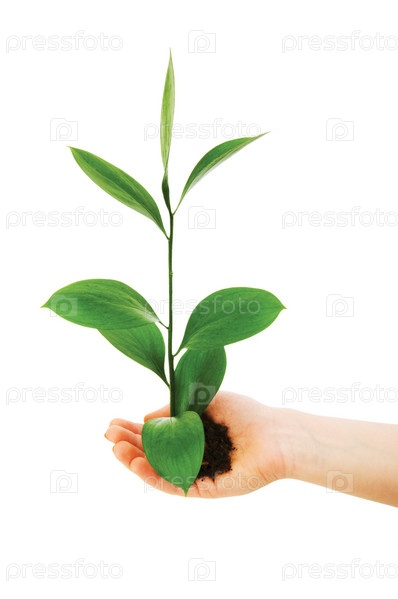 Зеленый саженец в руке изолированный на белом