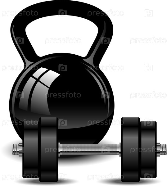 Гимнастические гантель и гиря на белом фоне