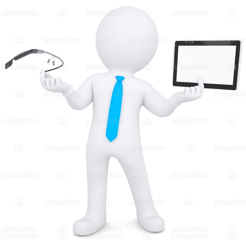 3D человек, держащий планшет и Google-глаза