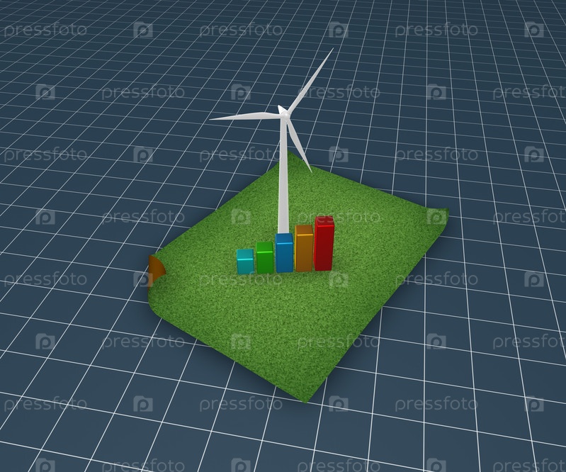 Ветряная турбина и график на куске травы. 3d Иллюстрация