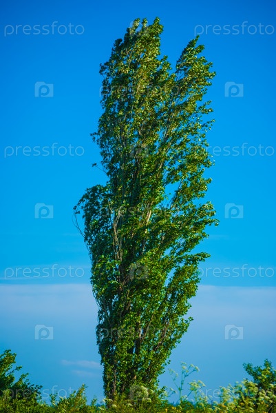 Зеленое высокое дерево на голубом небе