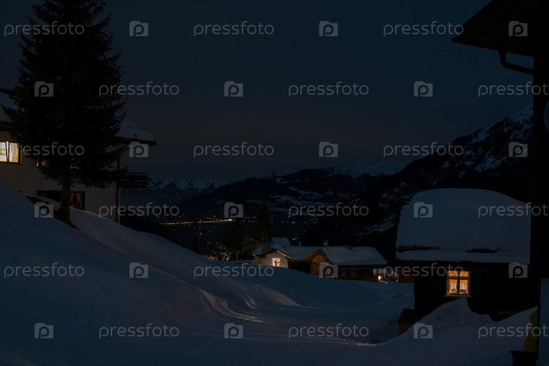 Горонолыжная деревня с часовней в ночное время