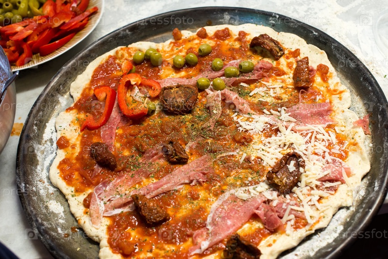 Сырая пицца и ингредиенты
