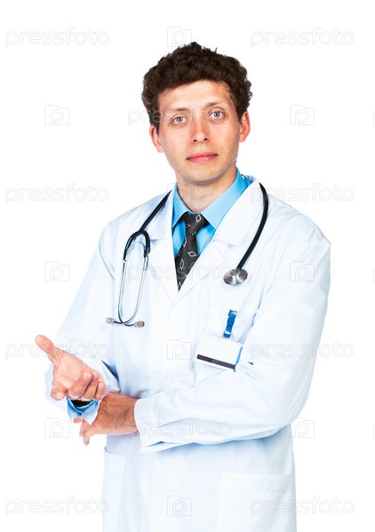 Портрет врача, показывающего на вас, на белом фоне
