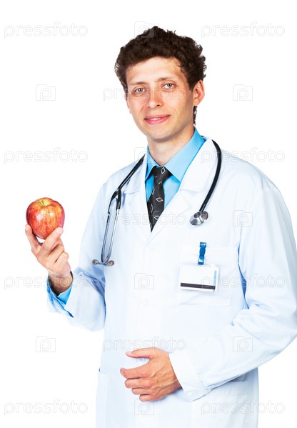 Портрет улыбающегося врача с яблоком