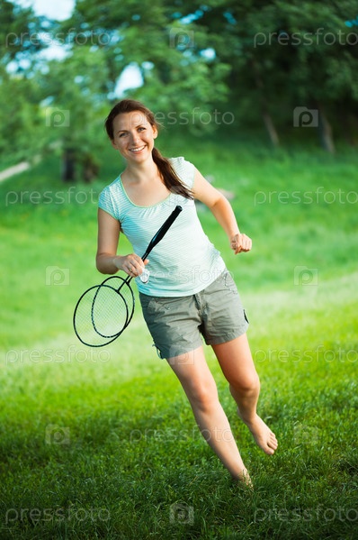 Улыбающаяся девушка с ракеткой для бадминтона в парке