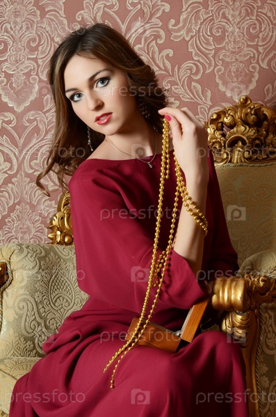Элегантная чувственная молодая женщина в бордовом платье