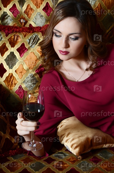 Чувственная женщина с бокалом красного вина на великолепном диване