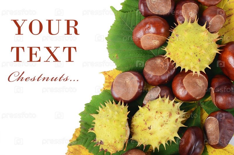 Каштаны на осенних листьях, изолированные на белом фоне