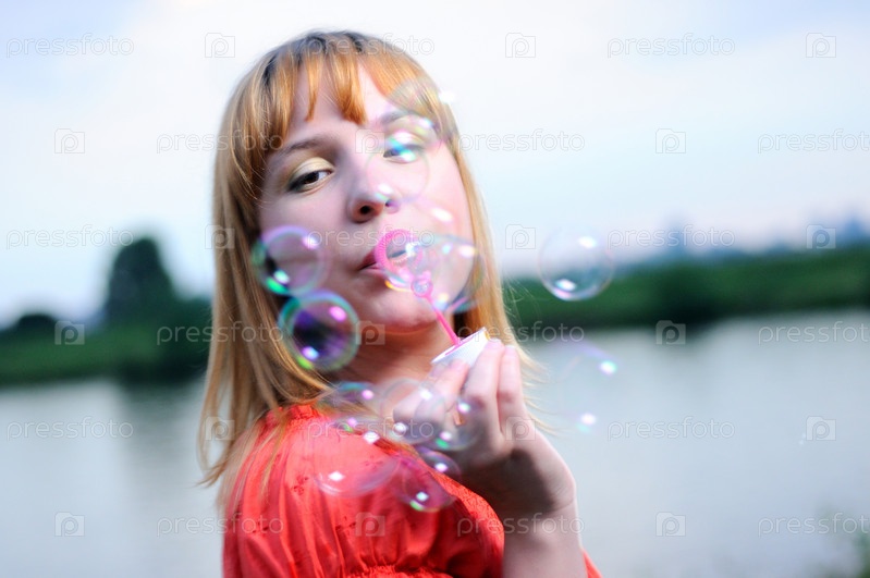 Молодая красивая девушка надувает мыльные пузыри