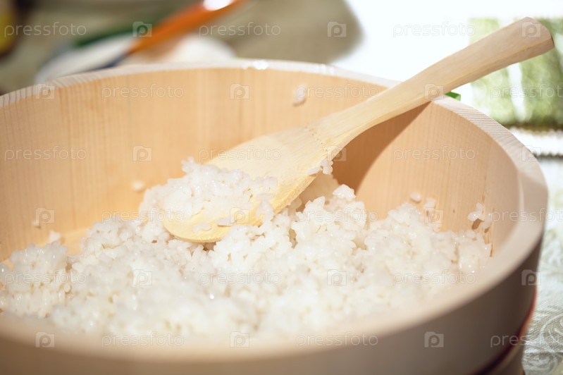 Приготовление суши. Перемешивание риса в деревянной тарелке