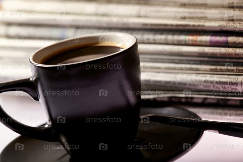Чашка кофе и стопка газет на столе