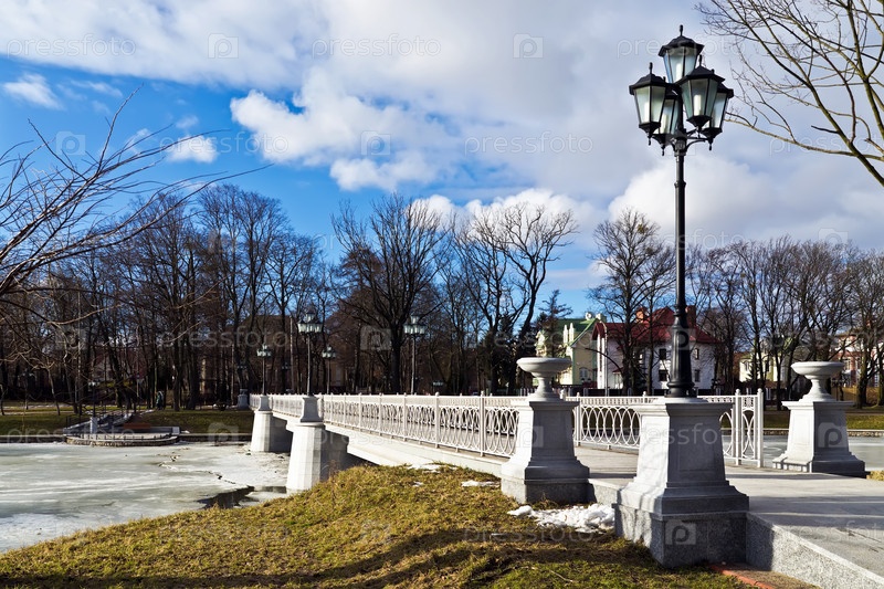 Красивый белый мостик на озере Верхнее. Калининград, Россия