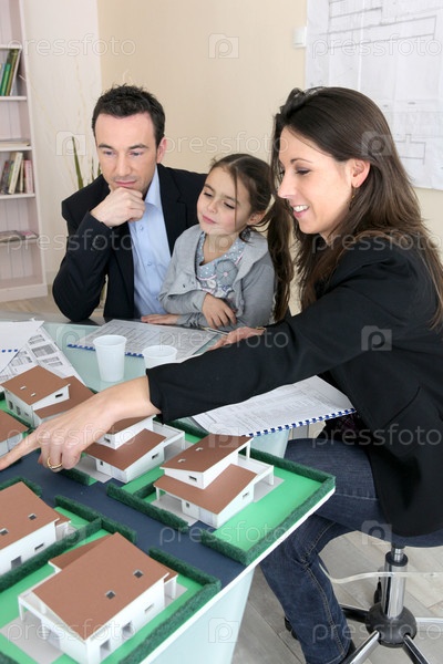 Молодая семья смотрит на модель жилищного строительства