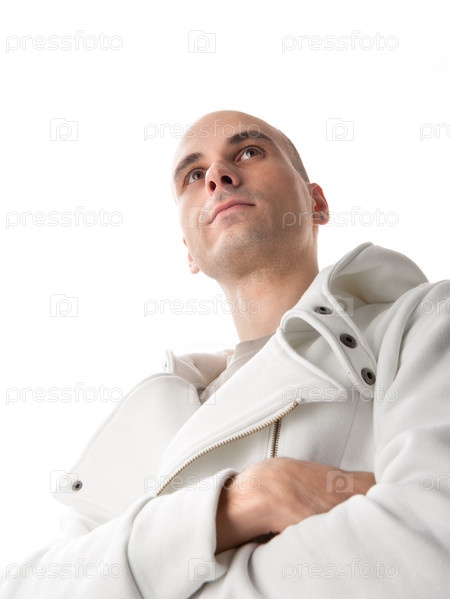 Мужчина в белой куртке на белом фоне