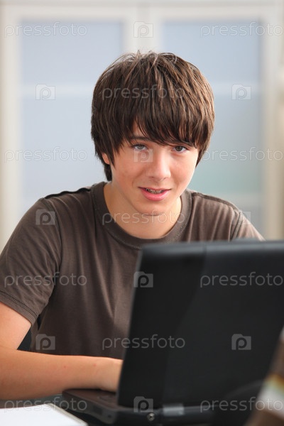 Подросток делает домашнюю работу в компьютере