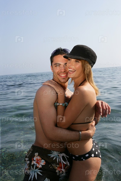 Привлекательная пара стоит, обнявшись, в море