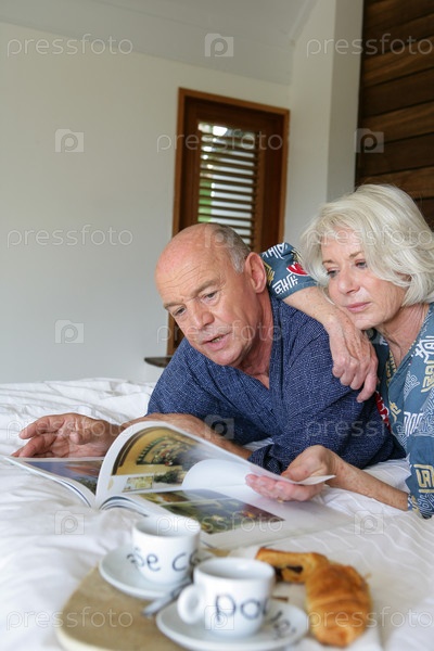 Пожилая пара читает журнал в постели