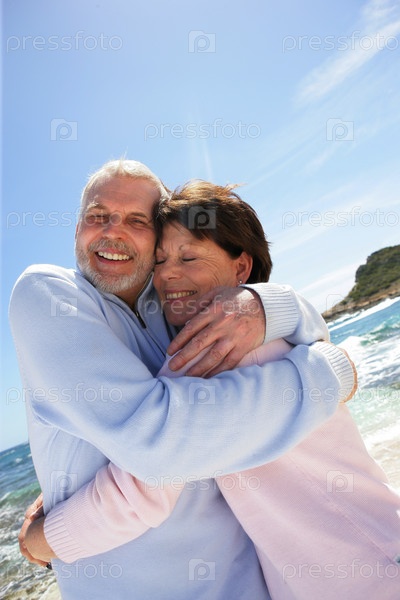 Пожилая пара обнимается на берегу моря
