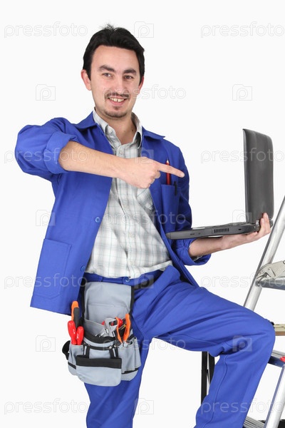 Сантехник с ноутбуком и различными инструментами