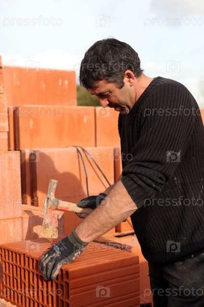 Строитель откалывает кирпич
