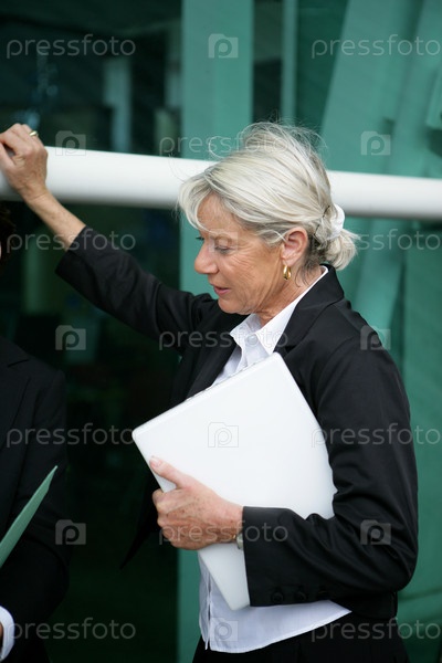 Пожилая бизнес-леди, прислонившаяся к зданию