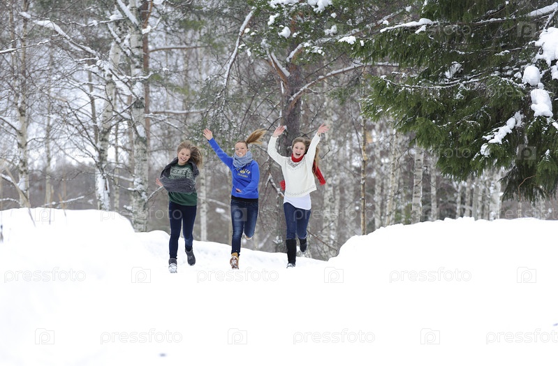 Девушки бегут по лесной тропинке