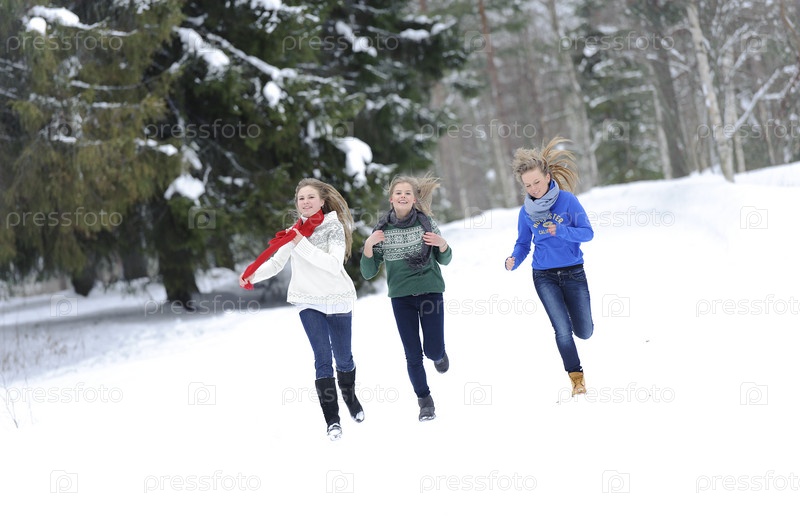 Девушки бегут по лесной тропинке