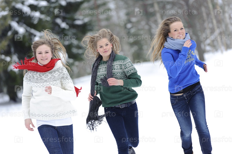 Девушки бегут по лесной тропинке