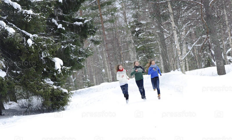Девушки бегут по лесной тропинке