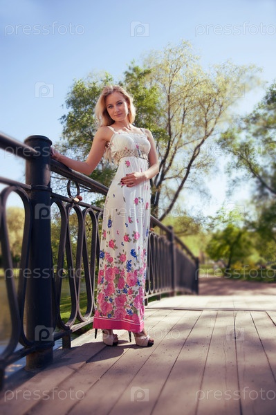 Красивая молодая женщина стоит на мосту