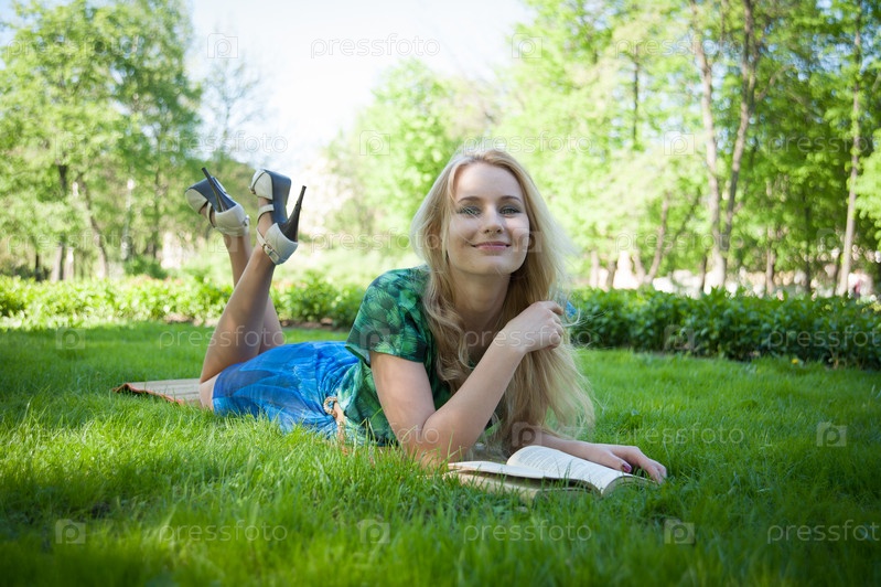 Девушка лежит на траве с книгой