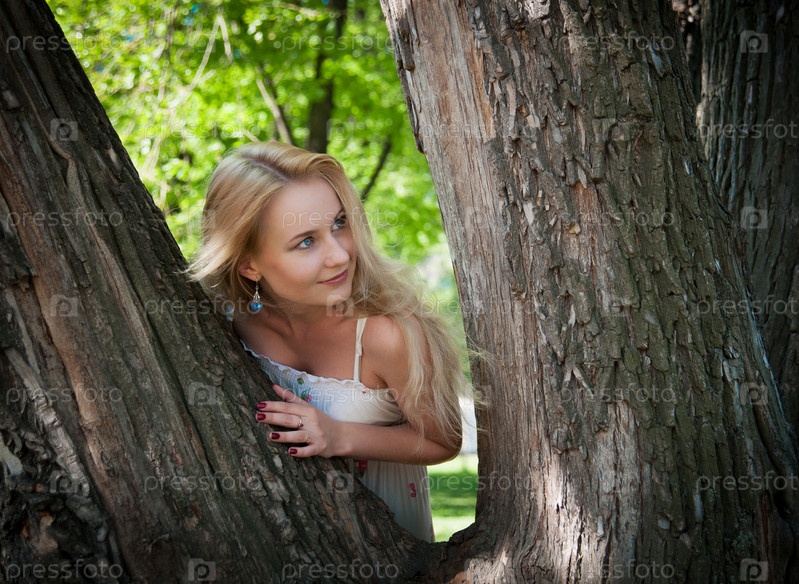 Красивая молодая женщина выглядывает из-за дерева