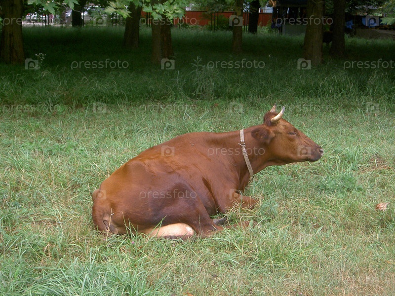 Коричневая корова, отдыхающая на траве