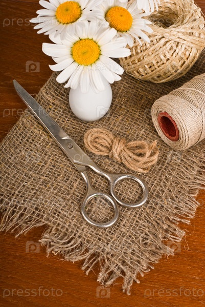 Ножницы, шнур и ромашки в вазе