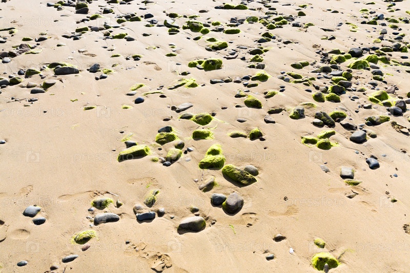 Камни, покрытые сухими водорослями, на песчаном пляже