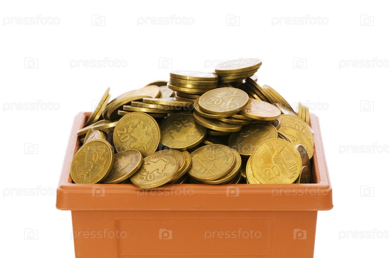 Много монет в глиняном горшке на белом