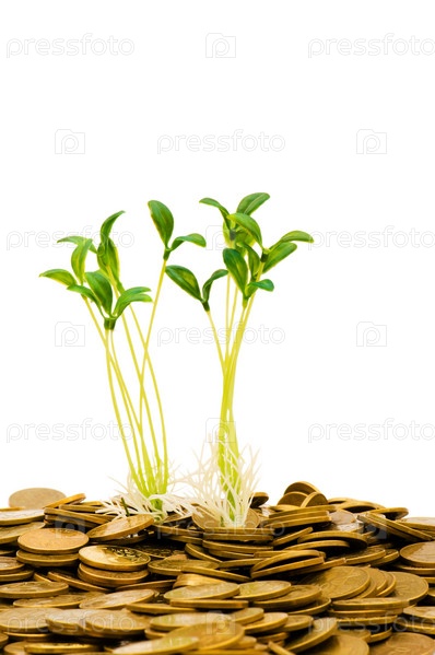 Много монет в глиняном горшке на белом