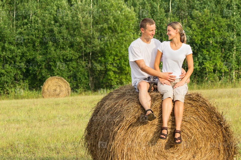 Двое молодых влюбленных на стоге сена