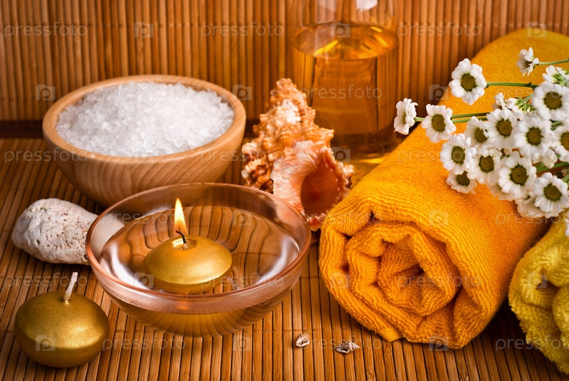Спа-натюрморт с ароматическими свечами, морской солью и полотенцами