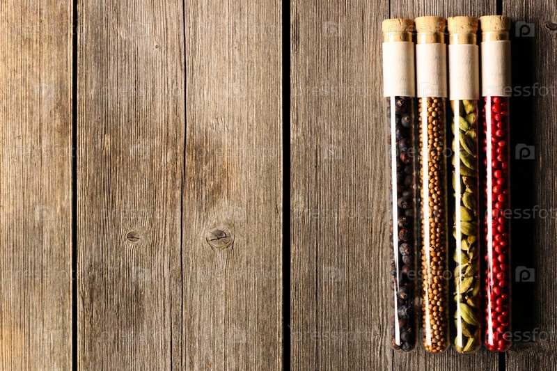 Специи в мензурках на деревянном столе