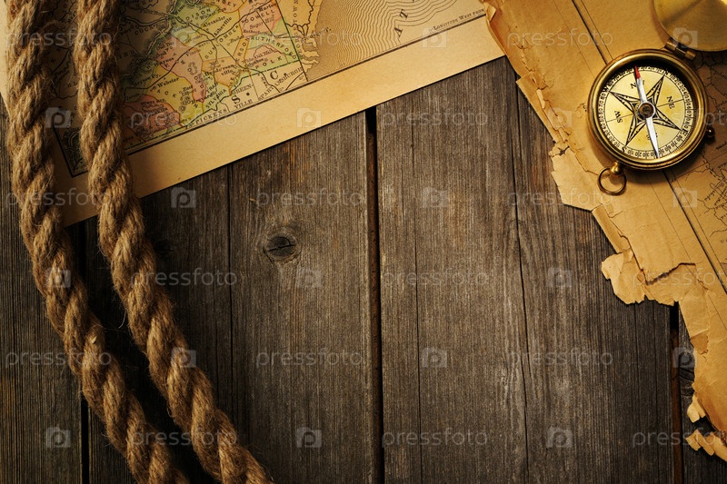 Антикварный компас и веревка на старой карте