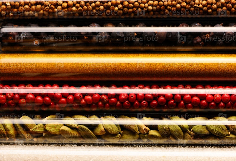 Специи в мензурках на деревянном столе