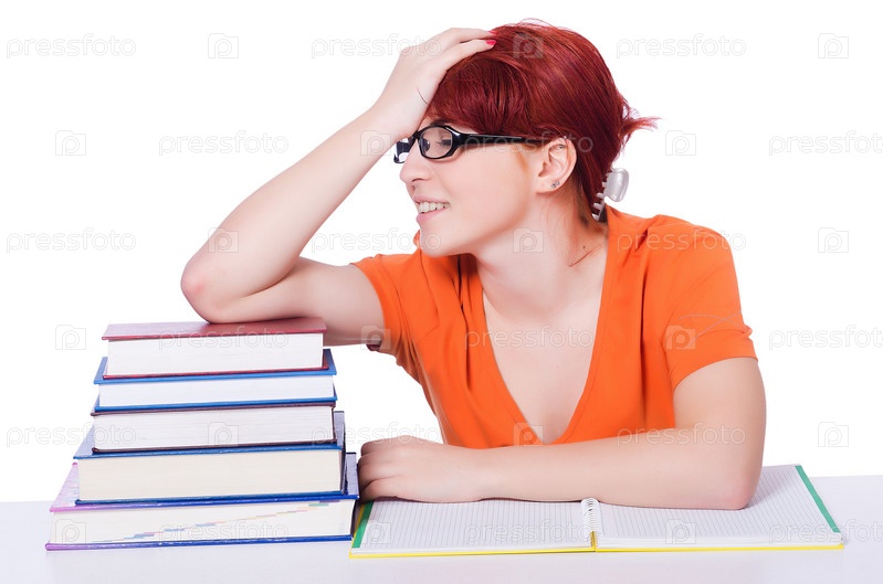 Студентка с книгами на белом фоне