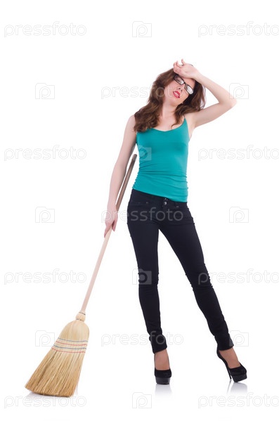 Молодая женщина с веником, изолированная на белом